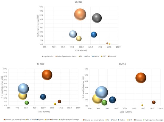 In Figure 7, the size of the bubbles corresponds to the amount of energy generated by each type of technology, whereas on the horizontal axis the LCOE of each unit type is presented, and on the vertical axis, the share of the cost of the different types of technologies in the total cost of the system is depicted.