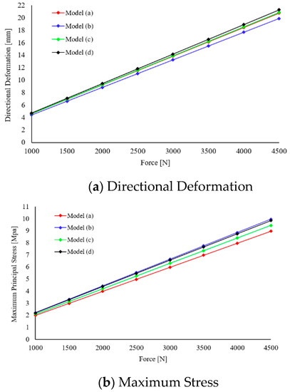 Table 4 shows the results of the directional deformation analysis for each model under a 4000 N load.