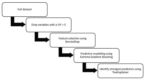 The aim of this study was to identify the best predictive variables, therefore, it was opted to apply a tree-based machine learning, which has the advantage of high interpretability and the possibility to apply a theoretically well grounded method such as TreeExplainer to identify the strongest predictors []. TreeExplainer uses Shapley values to explain the global model structure, by combining local explanations of each prediction []. Using TreeExplainer, it is possible to determine the importance of each feature [], on a global and local level. TreeExplainer was applied using the shap package. A graphical illustration on the workflow from the dataset to the identification of the best predictors is depicted in Figure 1.