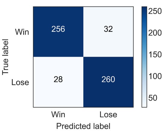 After the removal of variables using VIF and the feature selection procedure using BorutaShap, a total of 13 variables were used during the modelling procedure. The model showed a predictive accuracy of 89.6% ± 3.1%, correctly classifying 516 out of 576 games that resulted in a win or loss (precision: 88.9%; recall: 90.1%, f1-score: 89.5%; Figure 2). In Table 2, the misclassifications are further specified in relation to total goal difference.