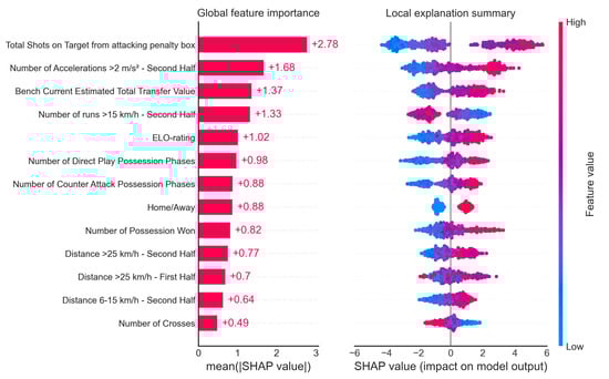 Feature importance based on SHAP-values. On the left side, the mean absolute SHAP-values are depicted, to illustrate global feature importance. On the right side, the local explanation summary shows the direction of the relationship between a variable and game outcome. Positive SHAP-values are indicative of winning, while negative SHAP-values are indicative of losing. As demonstrated by the colorbar, higher values are shown in red, while lower values are shown in blue. As an example, this shows that positive differences between total shots on target from the attacking penalty box between teams are associated with winning, while negative differences are associated with losing.