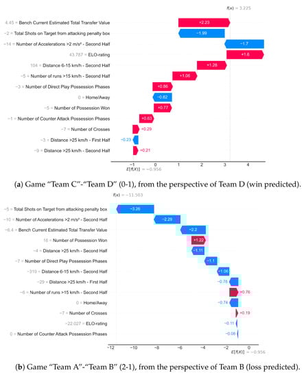 The most important predictors of the model are presented in Figure 3. As an illustration of the possibilities of local explanations using TreeExplainer, two individual game predictions are presented in Figure 4a,b.