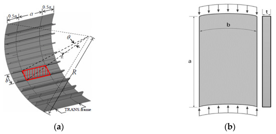 In the present study, a simple curved plate without stiffeners under longitudinal compression, as shown in Figure 1, is considered for the tests. The dimensions of the cylindrically curved plates are length (a), breadth (b), thickness (t), and flank angle (θ). The breadth (the length of an arc in a cylindrically curved plate) is kept constant at 400 mm throughout the experiment and throughout the finite element analysis.