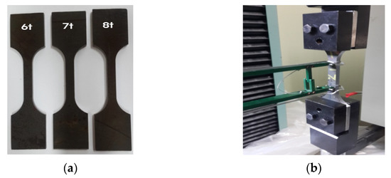 Tensile tests were performed to apply the precise values of material properties. Generally, the chemical composition of the material has a dominant influence on its mechanical properties. The specimens for material tensile tests were extracted from the plate for buckling collapse tests. In the present study, six tensile tests were performed in accordance with American Society for Testing and Materials (ASTM) standard A370. Figure 2a shows the representative tensile testing specimens with three different thicknesses, and Figure 2b shows the preparation of the material tensile tests. Table 2 shows the chemical composition of the selected material, and Table 3 shows the summary of the material tensile tests.