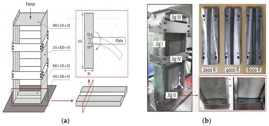 To achieve this condition, proper experimental jigs and fixtures were designed based on the reference studies [5,6,7]. The assembled fixtures with a sample specimen are shown in Figure. 3. A V-shaped groove is made in the fixture and the edge of the curved plate is located in the groove. In order to match the radius of each plate, three pairs of upper and lower jigs with radii matching to those of the specimens were produced. In addition, the loading condition of longitudinal compression was implemented by fixing the side and lower jigs and moving only the upper jig. To prevent the movement of side jigs (Jig I) while the specimen was subjected to a compressive load, steel bands (Jig IV) were installed in the top and middle parts of the jig, as shown in Figure 3b. It was designed to use the side jigs to maintain straightness while the load was applied. The misalignment of straightness was a phenomenon that occurred during or after removal from the jig due to the relaxation of internal stress.