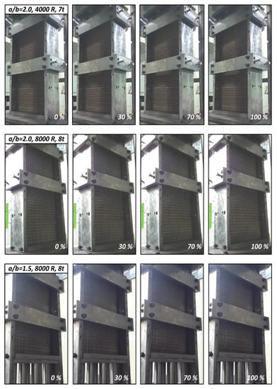 Figure 8 shows the effect of flank angle, slenderness ratio, and aspect ratio on the ultimate strength of curved plates based on the results of our experimental investigation. In Figure 8a, the average values of the experimental results for each condition are indicated using a solid line. From the figure, it can be confirmed that an increase in the flank angle causes an increase in the ultimate strength of curved plates. However, in the case of the slenderness ratio, the ultimate strength displays an unusual trend; the ultimate strength of relatively thin plates (t = 7 mm) is higher than that of relatively thick plates (t = 8 mm). This tendency is more prominent when the a/b ratio is 1.5 or when the flank angle is 11.45° (See Figure 8c).