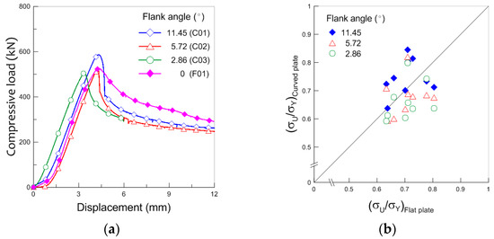 (a) Compressive load versus displacement curves of curved plates and (b) comparison of ultimate strengths of curved and flat plates.
