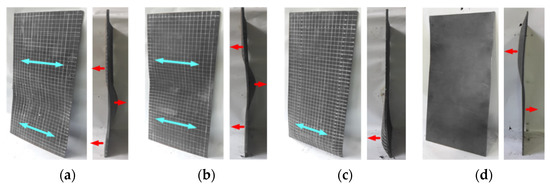 Collapse mode of curved plates after testing (a/b = 2.0, t = 6 mm): (a) C01, (b) C02, (c) C03, and (d) F01.