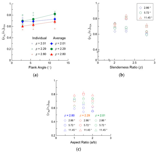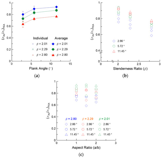Ultimate strength of the curved plates based on the results of FE analysis: (a) effect of flank angle, (b) slenderness ratio, and (c) aspect ratio.