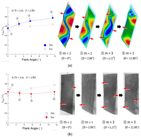 The buckling shapes of curved plates depending on the flank angle: (a) FE analysis and (b) experiment results.