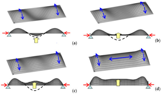 It is well known that the ultimate strength of a curved plate under longitudinal compression loading increases as the flank angle of the curved plate increases. When the compressive load equals the critical buckling stress, the plate starts to buckle. Increasing the axial load further causes an increase in the lateral deflection at the central part of the plate, and the increase in the lateral deflection causes an increase in the membrane stress; this in turn, causes stretching of the surface of plate at the bulged parts near the short edges, as shown in Figure 13 [12]. In addition, as shown in Figure 13c,d, an additional membrane stress is generated in a longitudinal direction at the central part of the curved plate when the flank angle is changed from 5° to 10°. This tensile membrane stress can restrain the lateral deflection of the plates and, as a result, a strength of the curved plate can be significantly improved when that curved plate has a flank angle in excess of 5°.