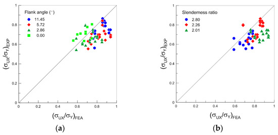 Comparison of FE analysis and experimental results: (a) effect of flank angle and (b) slenderness ratio.