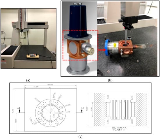 Structural dimensions measured by using coordinate measuring machine. (a) CMM Mitutoyo Beyond 707; (b) Internal structure measurement; (c) 3D diagram.