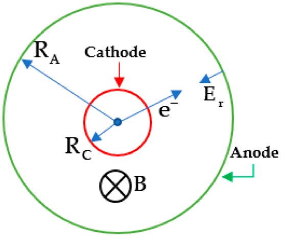 The electron motion in the magnetic field within the cylindrical radius of the cathode (RC) and the radius of the anode (RA) are excited by applying a high voltage (V0C) and a permanent magnetic field (B0C), with the magnetic field directed towards the page. The appropriate voltage and magnetic field are applied in order to cause the electron to be emitted from the cathode to the surface of the anode and then backwards to the interaction space area, as shown in Figure 3.