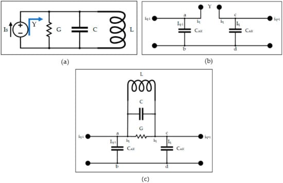 Analysis of the admittance values shown in Figure 5a,b when the resonance of the circuits occurs was conducted. The admittance values of the two-section configuration are equal. This means that both circuits can be rearranged and then the resonant frequency that occurs can be analyzed, as shown in Figure 5c. Moreover, a simple equation expressing the equivalent resonant circuit of the magnetron in each mode of operation is given as Equation (7).