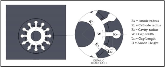 One of the most efficient sources of high-power microwave is a relativistic magnetron. A relativistic magnetron has the structure of a diode which mainly consists of the cathode and anode polarities confining electrons in between. The anode of the magnetron is usually manufactured by a cylindrical copper block configuration. The cathode and filament are installed in the central area of the anode block and supported by the filament leads. The filament leads are rigid in order to maintain the position of the cathode and filament. The anode is indirectly supplied with DC voltage to heat up the filament. This leads to electrons being emitted from the cathode surface, which is constructed from a high-emission material around the area of the cavity. In general, the cavity magnetron has been designed to possess eight or twenty cavities distributed around the cathode. It is called the resonant cavity, where each cavity forms a parallel resonant circuit, as shown in Figure 1.