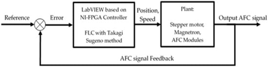 In Figure 12, the error of the system is the difference in the feedback signal between the AFC-A and AFC-B compared with the reference input. The error data are calculated and applied in the FLC rule base. Before the data are applied to the fuzzy controller, the data must be converted from measured data to proper data based on the preprocessing function of the fuzzy system. The verified data of the FLC rule base with the inference engine are also converted by postprocessing in order to use suitable output data for the system as required. The position and speed data are used for controlling the stepping motor in order to adjust the structural dimensions of the resonance cavity of the magnetron. Thus, the results of the AFC signal are also changed.