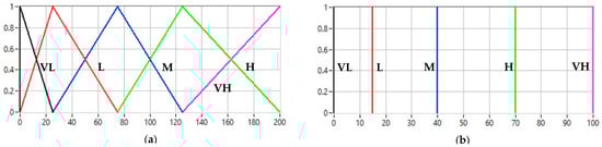 The determination of the input in order to use the fuzzy rule base requires the input data’s conversion or the process of fuzzification to obtain data for the suitable control system. This is described by the triangle-shaped membership functions graph that is shown in Figure 13a. Therefore, the converted data in the degree of membership can be expressed as in an Equations (13) and (14) and the results of the data of the input and output variables for the designed FLC are listed in Table 2.