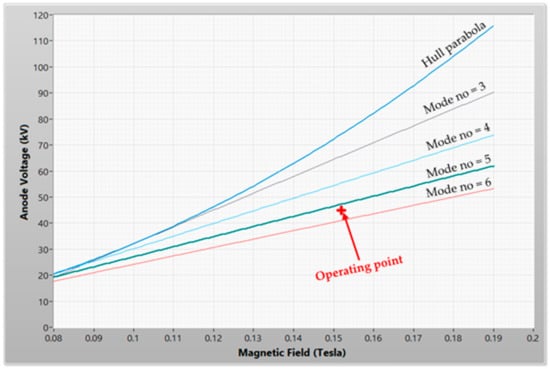 The boundary of the magnetron operation is ensured by using the Hull cut-off and Hartree conditions; these represent the range of the oscillation effect of the magnetron. The Hull cut-off condition is described as the maximum range of the magnetron’s operation that can occur if an electron moves to the adjacent anode block with zero velocity in the radius of the anode and assuming that the electron motion moves towards the cathode, referring to the laws of energy conservation. The Hartree condition, which represents the minimal range of the magnetron’s operation, determines the anode voltage and magnetic field that are necessary to obtain an anode current with a non-zero value. The electron’s motion in the interaction space around the cathode is determined by the magnetic field, which adheres to the laws of energy conservation and the condition of electron motion in a cylindrical coordinate that moves around the radius of the cathode with the same radius. Therefore, the equations to express anode voltage using the Hull cut-off and Hartree conditions are expressed as follows: