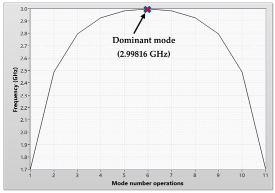 The magnetron is found to achieve the dominant mode in the frequency domain by using the equivalent parallel circuit in the one-section network of the magnetron. The structural dimensions and the presence of the electric and magnetic fields in the magnetron are also considered and used to analyze how this mode is achieved. The results of the resonant frequency indicate the frequency of each mode of operation of the magnetron between modes 1 to 11 and then sets the TSLOT at 3.97 mm in the dominant mode or pi-mode operation (mode number = 6) as 2.99816 GHz. Compared with the target frequency of 2.9982 GHz, this equates to a difference of 0.04 MHz or a relative error of 0.0013%, and the mode of operation results for the magnetron are shown in Figure 15.
