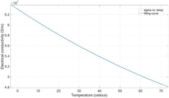 The PIC simulation was run based on the PC (Intel Core-i9, CPU3.1 GHz, and 32 GB-RAM) and the initial conditions listed in Table 4. The entire process of simulation takes 18 h and the simulation results of the electrical conductivity of annealed copper are exprssed in Equation (12), which substitutes the target temperature of the material with the temperature coefficient and the ambient temperature of 20 °C. The PIC simulation results at a temperature range of between 0 and 70 °C are shown in Figure 16 and Figure 17.