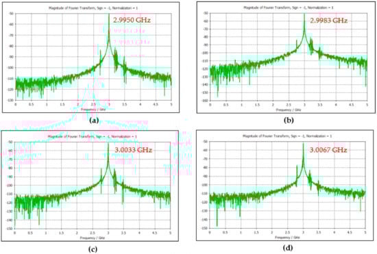 The results of the resonant frequency position for each tuner slot distance: (a) 3.22 mm; (b) 3.97 mm; (c) 5.22 mm; (d) 8.22 mm.