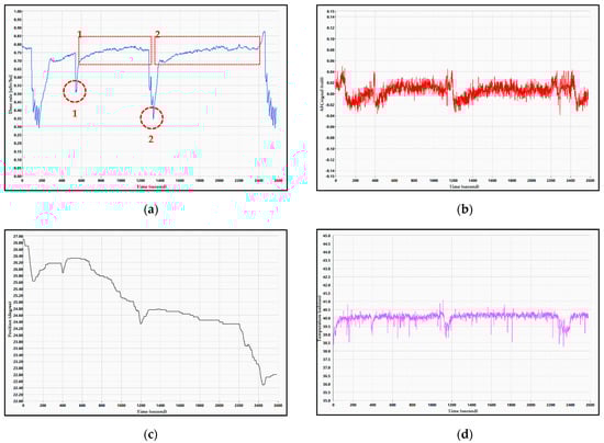 In Figure 21, the results of the designed FLC controller under a duration time of 45 min indicate that the response of the X-ray level is constant at 0.8 µSV/h within 12 min (see dot-rectangular #1) and 20 min (see dot-rectangular #1), respectively. During the experimentation, the X-ray dose rates decreased suddenly (see dot-circle #1 and #2) because the temperature changed by 1.5 Celsius, as illustrated in Figure 21d. The result of the resonant frequency generated by the magnetron shifted beyond the target frequency of 2.9982 GHz, and the frequency response converges at the desired boundary of the frequency if the system is controlled by the FLC, which compensates for the frequency difference by adjusting the tuner slot distance via a stepping motor, as shown in Figure 21c. This result of the X-ray response is constant. The compensation of the frequency depends on the AFC signal feedback or the difference in the forward and reflect signals compared with the reference frequency at 0 volts or 2.9982 GHz, and the motor position response is shown in Figure 21b.