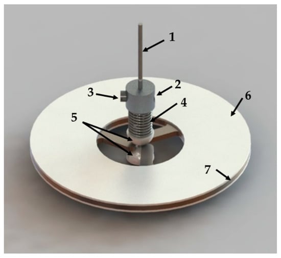 Design of the disc-type ultrasonic motor: (1) rotational shaft; (2) fastening sleeve; (3) fastening screw; (4) spring; (5) rotors; (6) piezoelectric ceramic ring; (7) titanium disc.