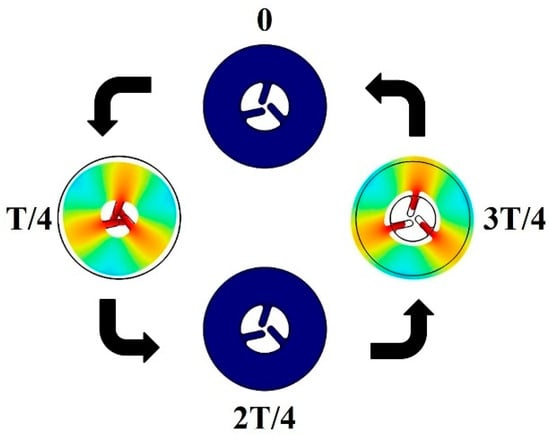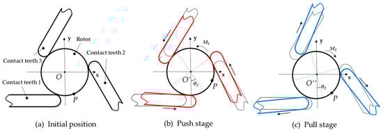 The actuating principle of the motor is mainly based on a “push–pull” motion [12] of its contact teeth, excited by the B03 vibration mode of the stator (Figure 4). It requires the contact teeth to obtain large longitudinal displacement under resonate mode. The contact teeth and the rotor have different frictional force in the push and pull stage, leading to the difference in the rotating moment. The rotating moment in the push stage is bigger than in the pull stage, and their relationship can be written as follow: