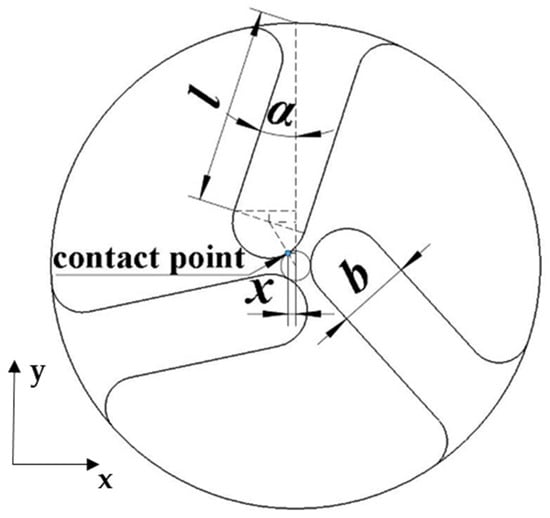where is oscillation amplitude of the contact point, b, l and α are the width, length and angle of the contact teeth, respectively, , and are the minimum/maximum limits of the width, length and angle, f is the resonant frequency of the stator and are the minimum/maximum limits of the frequency. As is shown in Figure 6, the horizontal distance between the contact point and the central axis x is related to the three variables, i.e., b, l and α. The similar triangle theorem is used to solve this plane analytic geometry problem, and the distance x is described as follows: Equation (7) is used to determine the position of the contact point when different length, width and angle of the contact teeth are applied: