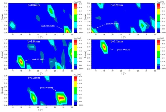 Boundary conditions of the model used for the optimization were set. The mechanical boundary of the stator was set to be free. The excitation scheme of the electrodes was used, as shown in Figure 3. The voltage amplitude of 20 Vpp was applied on the electrodes, and the frequency range was set from 98 kHz to 102 kHz with a frequency scan step of 0.1 kHz. 2D plots of the amplitude of contact points in B03 mode vary with length, width, and angle of contact teeth are shown in Figure 7. The color legend of the plot shows the value of the amplitude in the order of micrometers.