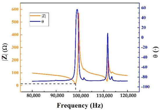 A prototype with optimal dimensions was made and assembled. The resonant frequency of the stator was measured by precision impedance analyzer Agilent 4294A. The result of the measurement is shown in Figure 9. In the graph, the orange line is curve and the blue one is curve, where is the impedance of the stator and θ is the phase shift. The frequency changes from 80 kHz to 120 kHz. The lowest point of the curve means that the stator has the lowest impedance at the corresponding frequency, which is 98.128 kHz. Therefore, the resonant frequency measured by the impedance analyzer is 98.128 kHz. The difference between the measured and simulated frequencies is approximately 0.98%.