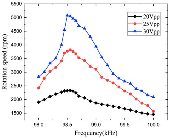 An experimental investigation was performed, to validate the operating principle and to assess output performance of the motor (Figure 11). A motor prototype was set up into a holder and excited by a single channel of sinusoidal excitation. A laser tachometer was used to record the rotation speed of the motor, when input voltage and frequency changed. Figure 12 shows the relationship between motor driving frequency and rotation speed, under different input voltage. It is apparent that the prototype produces the best output performance under the frequency of 98.5 kHz, which verifies the ideal driving performance of in-plane B03 mode. The maximum unloaded rotational speed of the motor reached 5172 rpm when 30 V was applied.