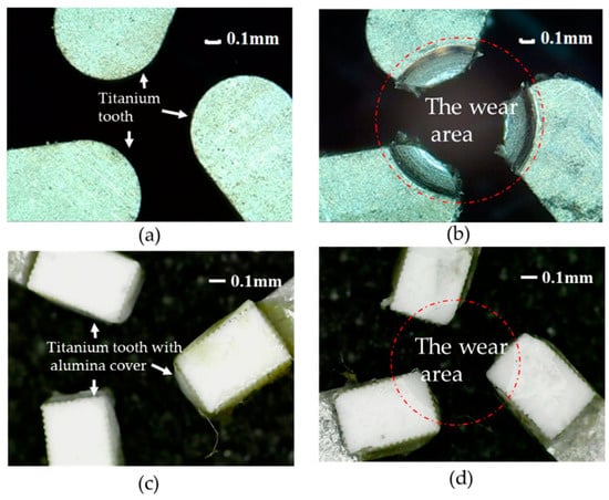 (a) Surface condition of titanium teeth before wear; (b) surface condition of titanium teeth after wear; (c) surface condition of alumina coated titanium teeth before wear; (d) surface condition of alumina coated titanium teeth after wear.