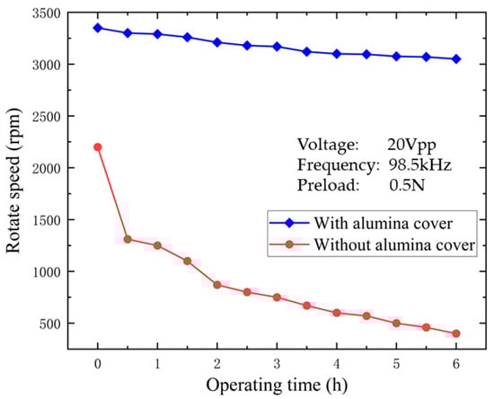 The ultrasonic motor is generally used in intermittent working situations due to its friction driving principle. Long-term continuous operation of the USM will bring serious friction and wear, which will result in a sudden drop of the performance or even cause it to stop working. The present design is aimed to be used in continuous operation in high rotation speed scenarios, so it is important to reduce the friction and wear, and effectively prolong the working life of the USM. Figure 13a shows the initial surface state of the titanium contact teeth without a protective layer. Figure 13b shows the wear of the contact teeth after six hours of continuous testing, and it is noticed that the teeth surface is seriously worn. To alleviate the performance degradation caused by friction and wear, an alumina ceramic cover was pasted on the contact teeth, to extend the service life of the USM. Figure 13c shows the initial surface state of alumina covered titanium teeth before wear, and Figure 13d shows the surface condition of alumina covered titanium teeth after six hours of continuous testing. By comparing the two experimental results, the stator covered with alumina is more wear-resistant than that with no coatings. Moreover, the alumina–alumina contact interface has superior mechanical transmission efficiency than the alumina–titanium contact interface. Figure 14 shows rotation speed changes of the USM versus the operating time between parts with and without alumina coatings. It is indicated that the USM with alumina coated stator teeth has a larger initial output speed of 3321 RPM and a much lower output speed drop of 13%, while the corresponding values of the compared USM which did not have alumina coated stator teeth are 2240 rpm and 88%, respectively. Therefore, the alumina coating layer plays an important role in improving the output performance and working life of the designed ultrasonic motor.