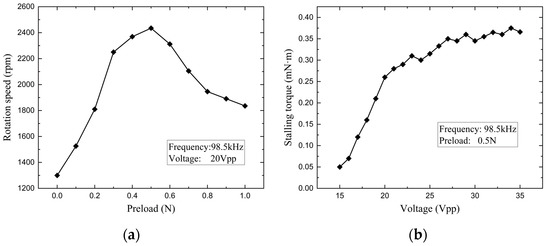 (a) Rotational speed of the USM versus preload; (b) stalling torque of the USM versus driving voltage.