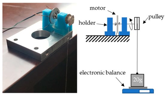 Figure 15a shows the response of the unloaded rotational speed, with different preload force. It is found that when the preload is 0.5 N, the USM obtains the highest rotational speed. Figure 16 shows the setup of the stalling torque measurement. The shaft of the USM passes through two bearings which are supported by a holder and connects to a pulley. The diameter of the pulley is 6.4 mm, and the relation between input voltage and stalling torque is shown in Figure 15b. Maximum stalling torque is about 0.35 mN·m when driving voltage reaches 30 Vpp. The power efficiency of it can be calculated by the following equation after getting the needed parameters: