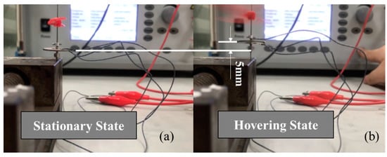 Hover flight test of the piezoelectric rotor system. (a) Stationary state. (b) Hovering state.