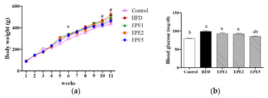Effects of Echinacea purpurea ethanol extract on (a) body weight change and (b) blood glucose level in high-fat diet (HFD)-induced obese rats. Data are shown as the mean ± standard error of the mean (S.E.M.) (n = 5). The values with different superscript letters (a,b) are significantly different (p < 0.05), as determined via one-way analysis of variance (ANOVA), and were analyzed by Duncan’s multiple range test. * p < 0.05 control versus HFD, EPE1, EPE2, and EPE5 and # p < 0.05 HFD versus EPE5.