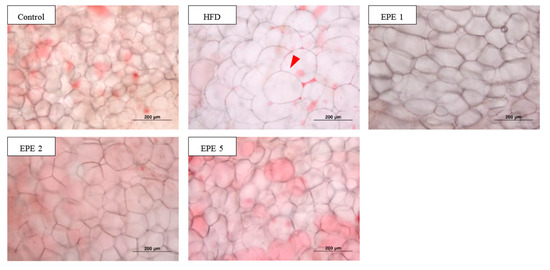 Adipocyte morphology was analyzed based on number and size distribution. Adipocytes that are fewer in number and have large sizes. The fewer large sized cells are hypertrophic while those with more small cells are hyperplastic [26]. It was observed that large adipocyte tissues were formed in the HFD group, whereas EPE groups recovered the normal morphology of adipocytes, especially in EPE5 (Figure 2). This result was supported by Table 1, in which the adipocyte diameters are given. Our results showed that the HFD group had higher adipocyte diameters (161 µm) than others and the diameters decreased from the EPE 1 to EPE5 treated groups. The average diameters of EPE 1, EPE 2, and EPE5 were 136.25, 118.25, ad 101.75 µm, respectively. The lowest diameter was observed in the control group.
