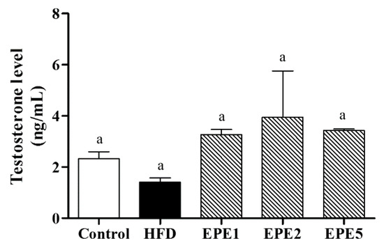 A previous study mentioned that a low level of testosterone in the blood is an indicator of obesity and abdominal fat accumulation [27]. Testosterone level in plasma was given in Figure 3. It was noted that testosterone level was lower in the HFD group and higher in EPE groups. As compared to the control group, the level of testosterone was also increased in EPE groups.