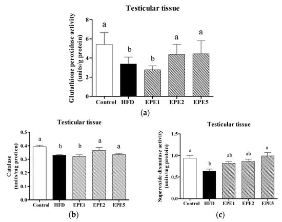 Effects of Echinacea purpurea ethanol extract on (a) glutathione peroxidase activity, (b) catalase, and (c) superoxide dismutase activity in testicular tissue of HFD-induced obese rats after 5 weeks. Data are shown as the mean ± S.E.M. (n = 5). The values with different superscript letters (a,b) are significantly different (p < 0.05), as determined via one-way ANOVA, and were analyzed by Duncan’s multiple range test.