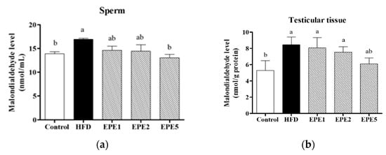 MDA production was measured in both sperm and testes (Figure 5). As shown in Figure 5a, the MDA production was higher in the HFD group and lower in the EPE5 group. MDA levels in control and EPE5 groups were not significantly differed. The MDA production was slightly increased in both EPE1 and EPE2 groups when compared to the EPE5 group. Like Figure 5a, the MDA level was also increased in the testes of the HFD group. A dramatic decrease in MDA production was observed from EPE1 to EPE5 groups but it was statistically higher than the control group.