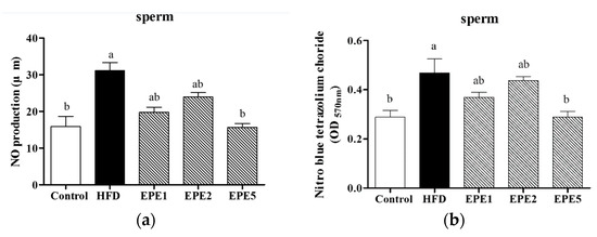 Effects of Echinacea purpurea ethanol extract on (a) nitric oxide production and (b) and nitroblue tetrazolium reduction in sperm of HFD-induced obese rats after 5 weeks. Data are shown as the mean ± S.E.M. (n = 5). The values with different superscript letters (a,b) are significantly different (p < 0.05), as determined via one-way ANOVA, and were analyzed by Duncan’s multiple range test.