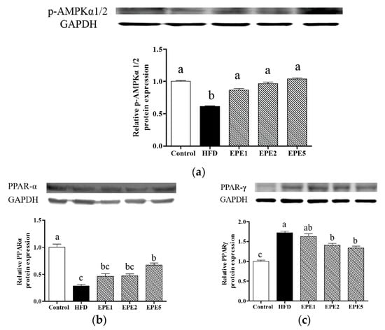 Effects of Echinacea purpurea ethanol extract on liver protein expression of (a) Phospho-Adenosine Monophosphate-Activated Protein Kinase Alpha 1/2 (p-AMPKα1/2), (b) Peroxisome Proliferator-Activated Receptor Alpha (PPAR-α), and (c) PPAR-γ in HFD-induced obese rats after 5 weeks. Data are shown as the mean ± S.E.M. (n = 5). The values with different superscript letters (a–c) are significantly different (p < 0.05), as determined via one-way ANOVA, and were analyzed by Duncan’s multiple range test.