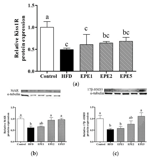 Effects of Echinacea purpurea ethanol extract on hypothalamus mRNA protein of (a) Kiss1R and testes mRNA protein of (b) Steroidogenic Acute Regulatory Protein (StAR) and (c) 17β-HSD3 in HFD-induced obese rats after 5 weeks. Data shown as the mean ± S.E.M. (n = 5). The values with different superscript letters (a,b) are significantly different (p < 0.05), as determined via one-way ANOVA, and were analyzed by Duncan’s multiple range test.