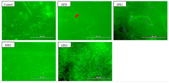Both sperm morphology and sperm parameters were observed under the microscope. It was found that the sperm of the HFD group showed abnormal morphology of both heads and the sperm count was also reduced (Figure 9). The total sperm count, motility, and abnormal sperm count in each group are further compared in Table 5. The results showed that the total number of spermatozoa and motility in the HFD group decreased significantly. It was found that EPE extract improved the motility of sperm and reduced the number of abnormal sperms. The results showed that EPE can improve the total number of sperm and reduce the abnormal sperm caused by obesity.