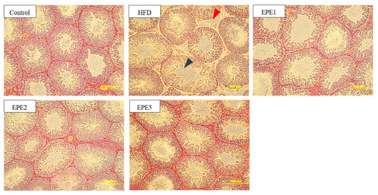 The testes of the rats were sectioned and observed by H&E staining (Figure 10). The figure shows that the testicular tubules of the HFD group had vacuolization and the number of mature spermatozoa was relatively small (blue arrow). The structures of interstitial cells are loose and atrophic (red arrow), but after the administration of different doses of EPE, the testicular pattern significantly improved.
