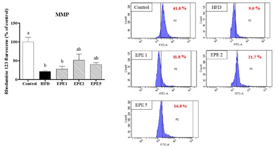 Effects of Echinacea purpurea ethanol extract in the sperm mitochondrial membrane potential in HFD-induced obese rats after 5 weeks. Data are shown as the mean ± S.E.M. (n = 5). The values with different superscript letters (a,b) are significantly different (p < 0.05), as determined via one-way ANOVA, and were analyzed by Duncan’s multiple range test.
