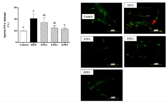 Effects of Echinacea purpurea ethanol extract in sperm DNA damage in HFD-induced obese rats after 5 weeks. Data are shown as the mean ± S.E.M. (n = 5). The values with different superscript letters (a,b) are significantly different (p < 0.05), as determined via one-way ANOVA, and were analyzed by Duncan’s multiple range test.